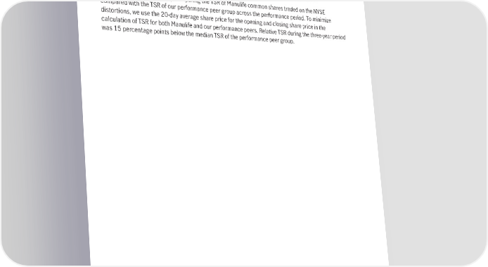 The performance criteria were set in late 2019 and were not subsequently adjusted for the impact of COVID-19 or for any P&C hurricane claim losses. In calculating the performance factor, the board excluded the impact of the 2019 and 2021 charges related to updating the URR assumptions issued by the Canadian Actuarial Standards Board, and the impact of the restructuring charge taken in 2021. These adjustments increased the performance factor by 3 points. The board adjusted for the impact of these items because we believe compensation should be aligned with long-term shareholder value: senior executives should not be penalized when they take actions that are in the long-term best interest of shareholders even though there may be short term effects on core ROE or book value per share, or where there are legislative or regulatory changes outside our control. Relative TSR is calculated by comparing the TSR of Manulife common shares traded on the NYSE compared with the TSR of our performance peer group across the performance period. To minimize distortions, we use the 20-day average share price for the opening and closing share price in the calculation of TSR for both Manulife and our performance peers. Relative TSR during the three-year period was 15 percentage points below the median TSR of the performance peer group. 66 Manulife Financial Corporation